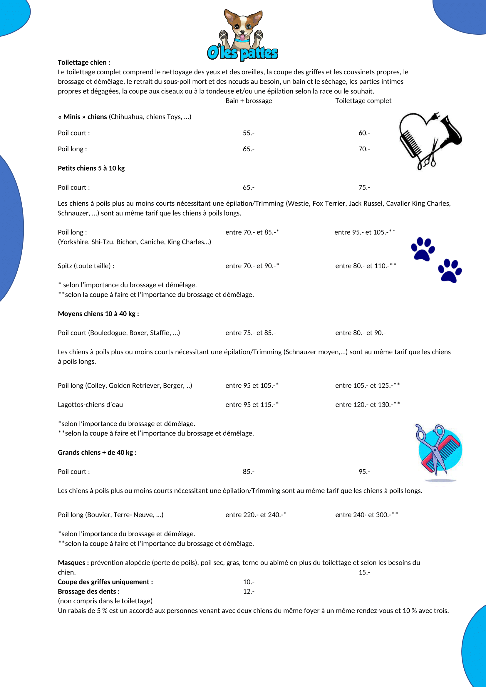 *Les chiens à poils plus au moins courts nécessitant une épilation/Trimming (Westie, Fox Terrier, Jack Russel, Cavalier King Charles, Schnauzer, …) sont au même tarif que les chiens à poils longs.