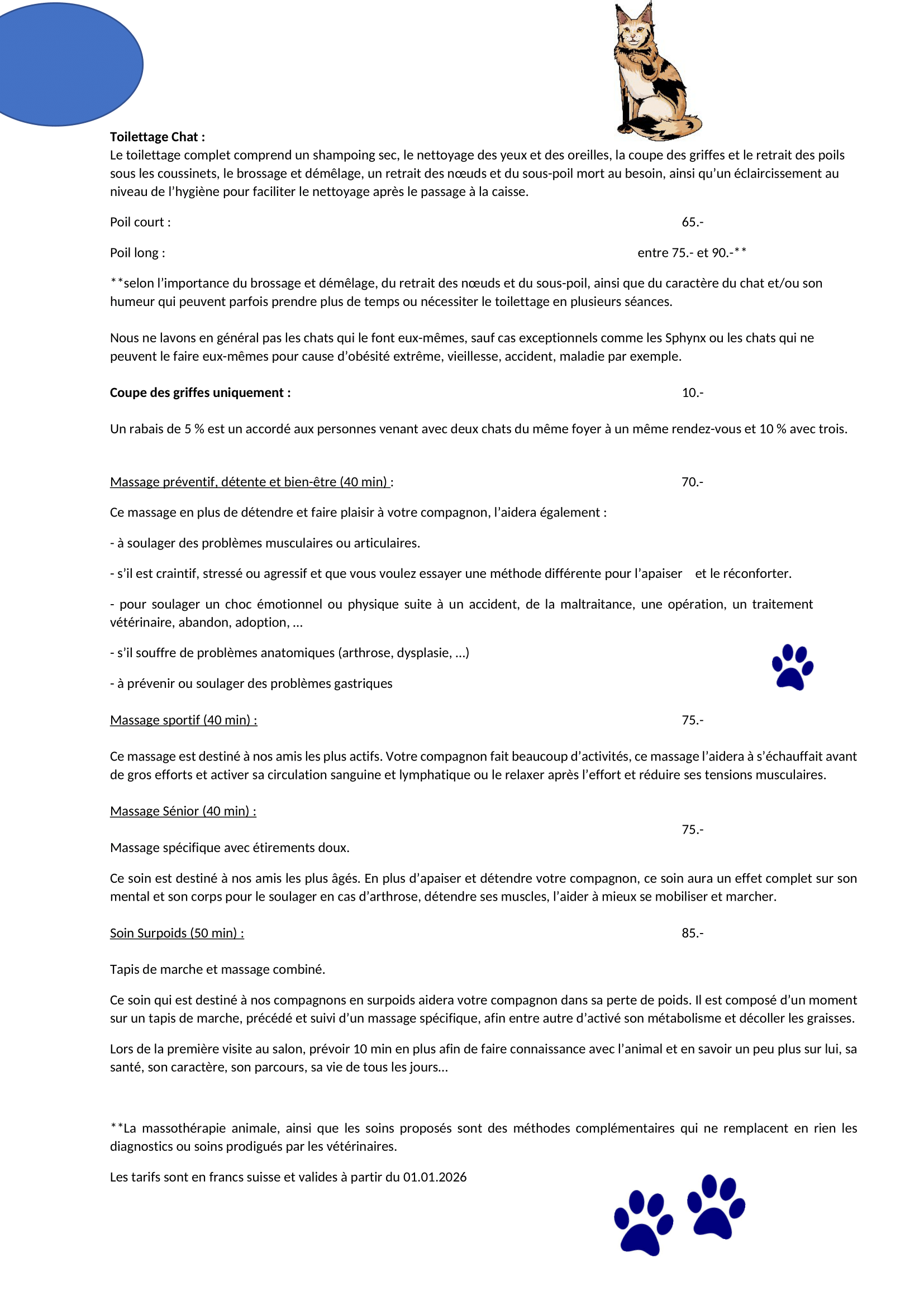 | Poil court | CHF 55.- | CHF 60.- |